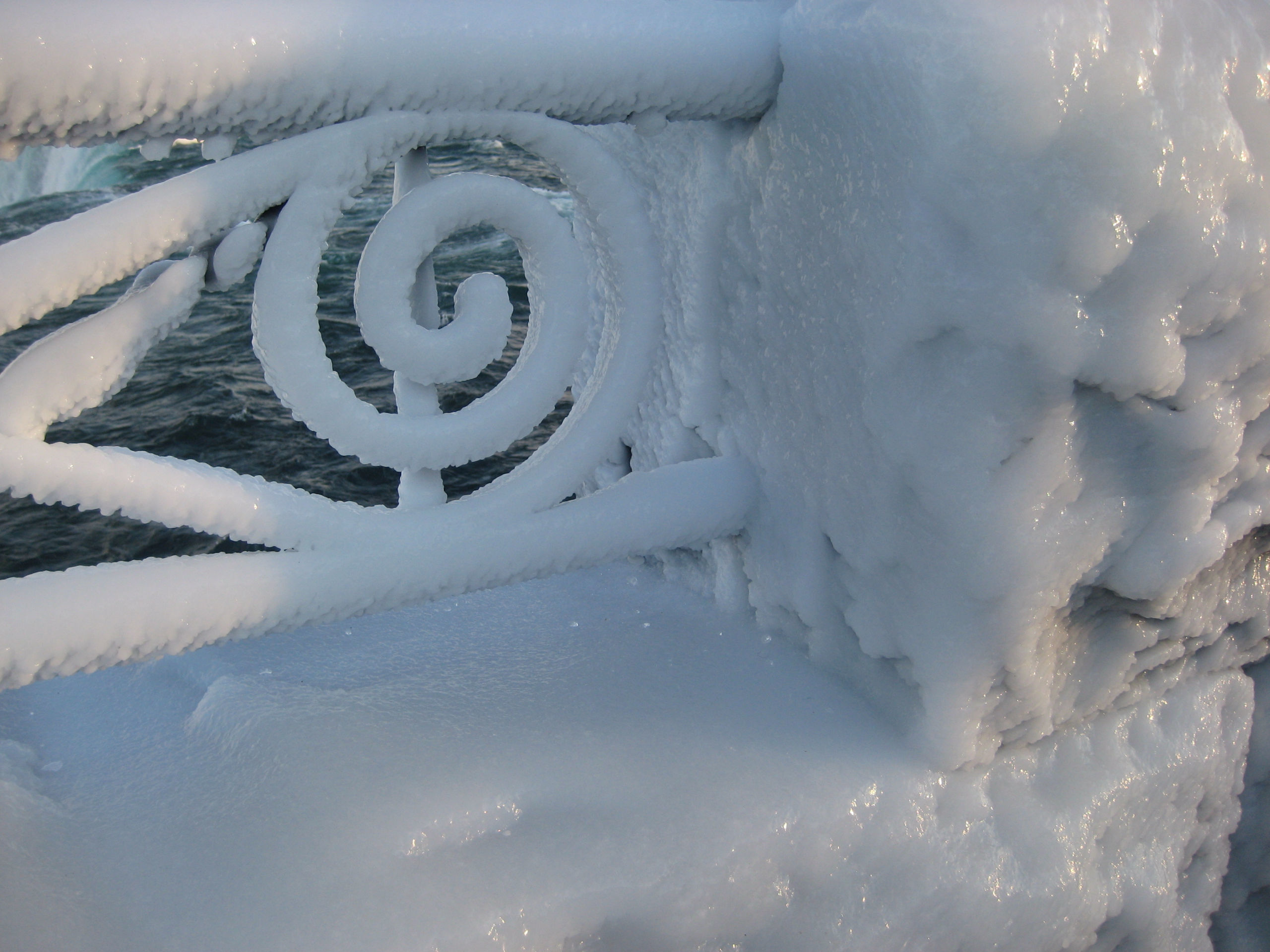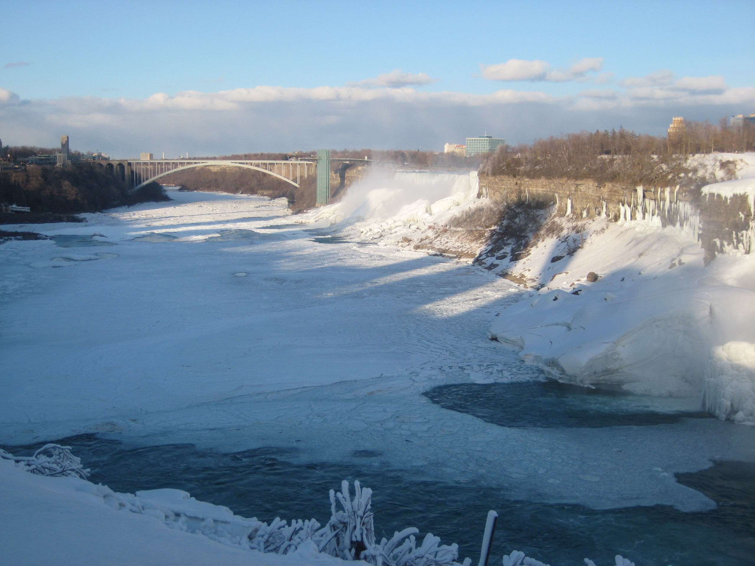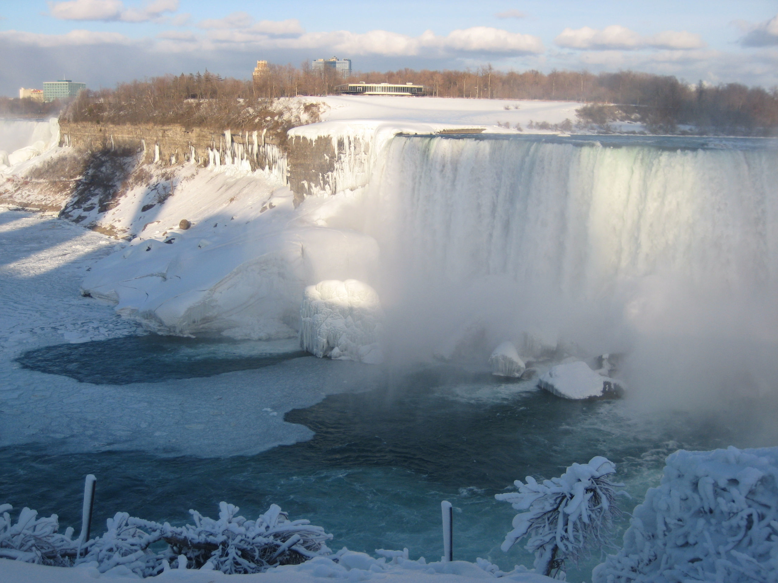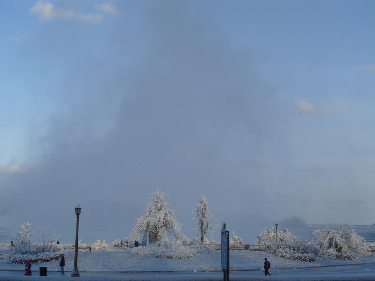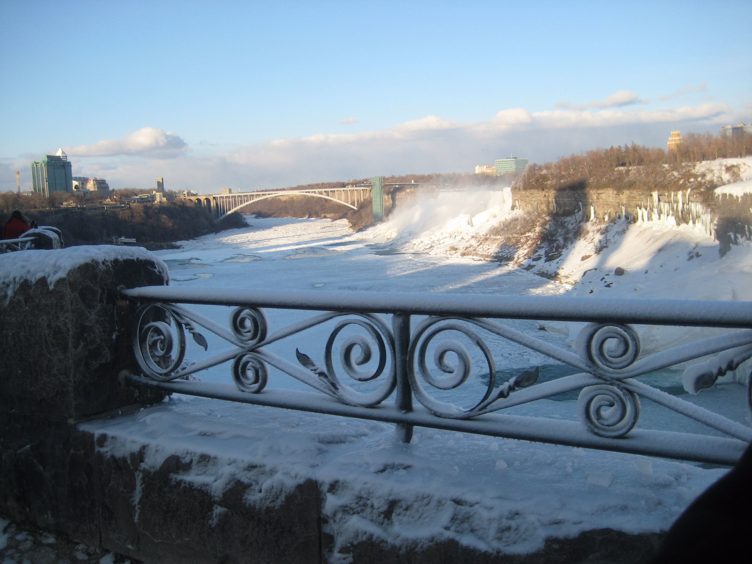 Зимой всё вокруг водопада в ледянной броне-мосты, деревья, фонари и люди.